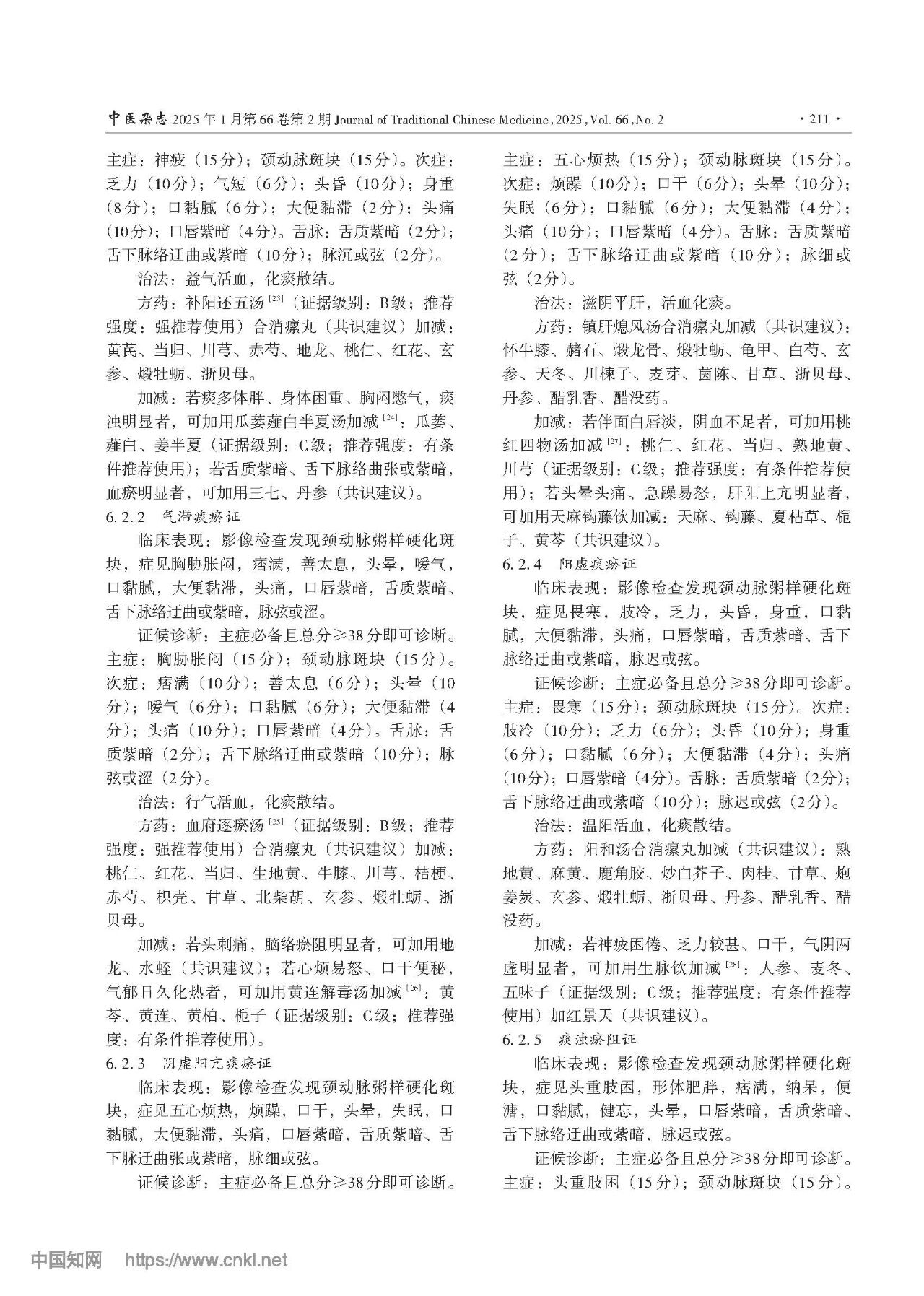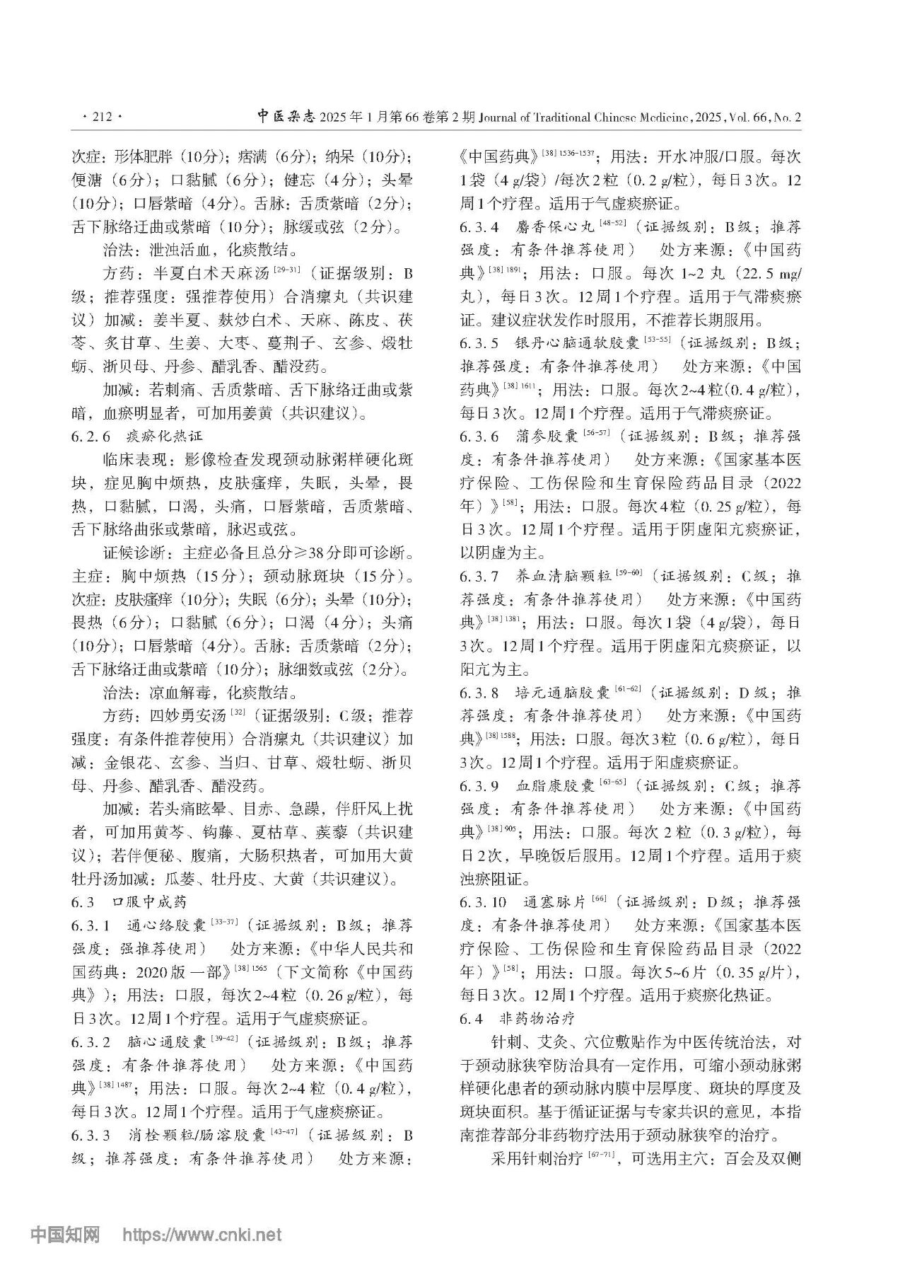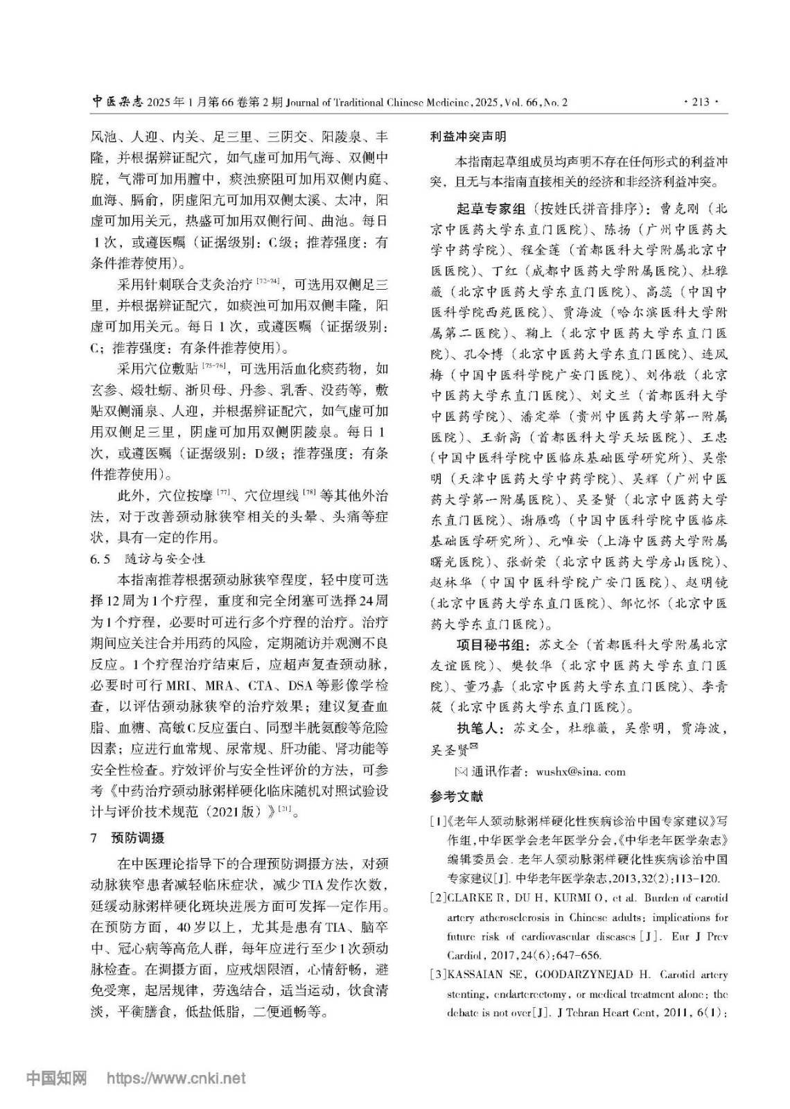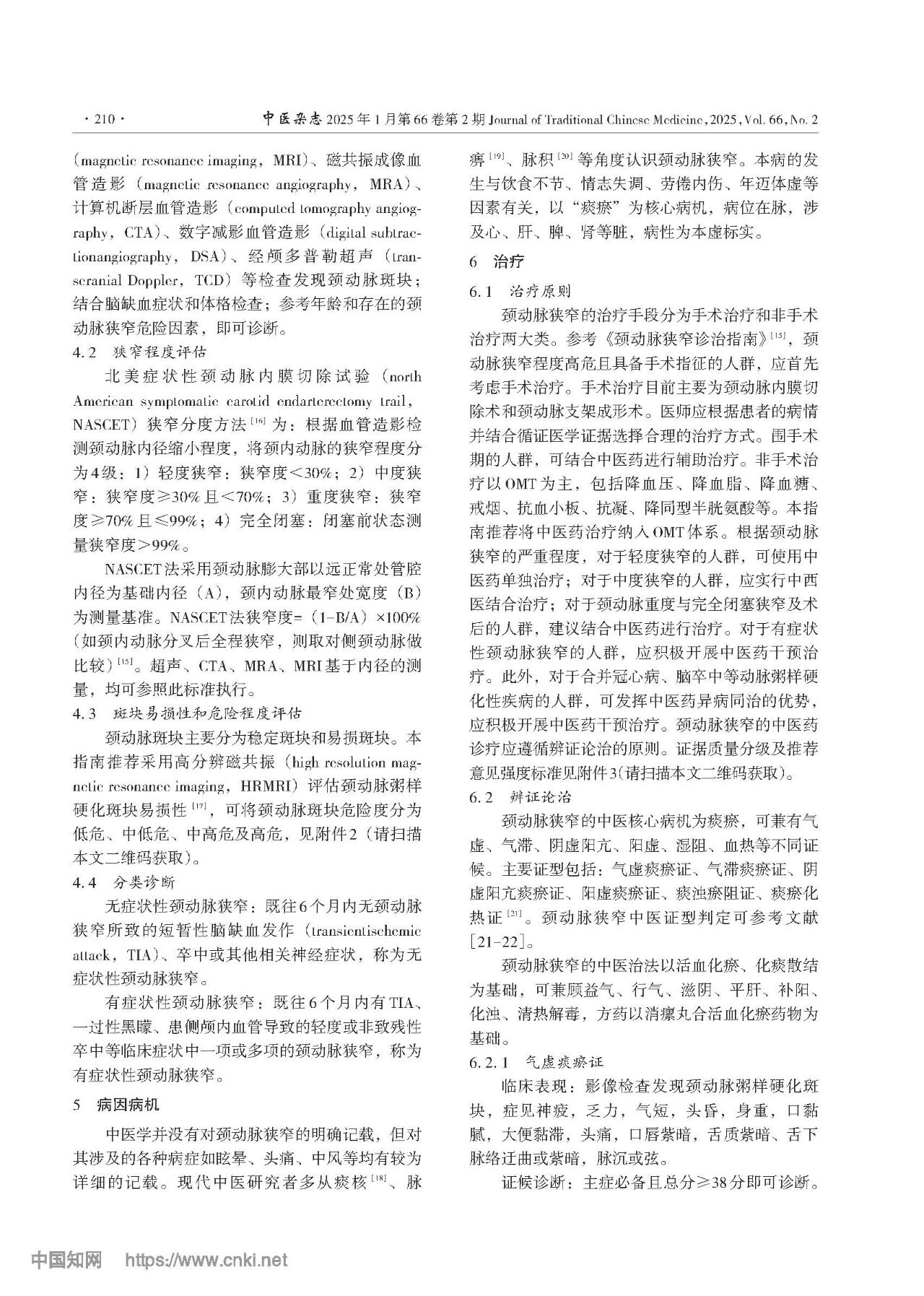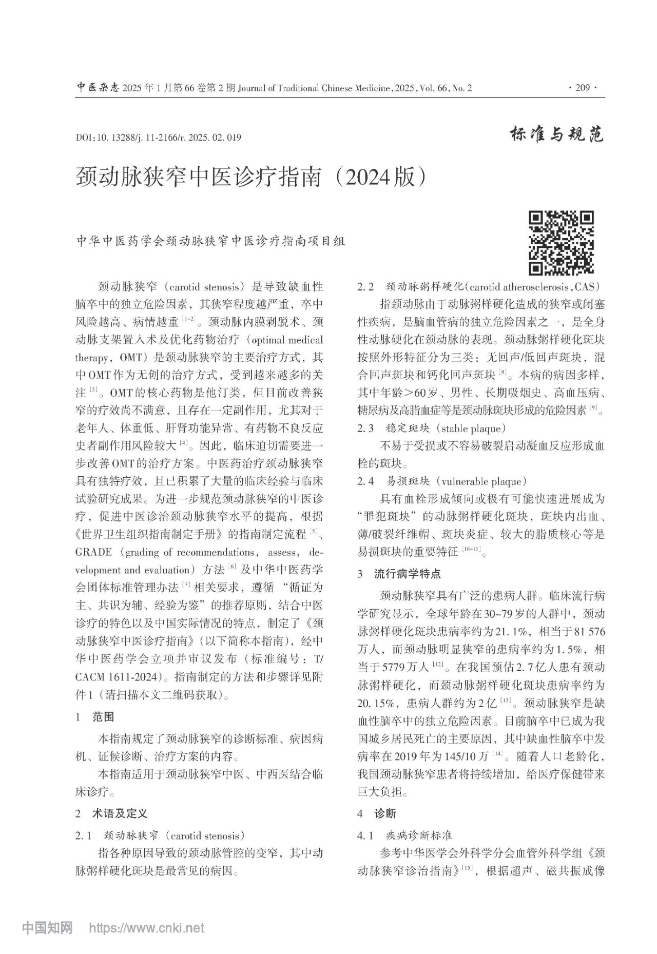进展 | 颈动脉狭窄与中医治疗颈动脉狭窄中医诊疗指南(2024版)颈动脉内膜剥脱术、颈动脉支架置入术及优化药物治疗(optimal medical therapy,OMT)是颈动脉狭窄的主要治疗方式。2025年,《颈动脉狭窄中医诊疗指南(2024版)》发布。该指南推荐,将中医药治疗纳入OMT体系。指南原版全文如下:
